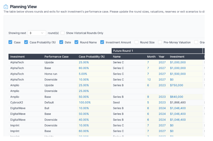 The Planning View enables you to change assumptions for rounds within an investment.