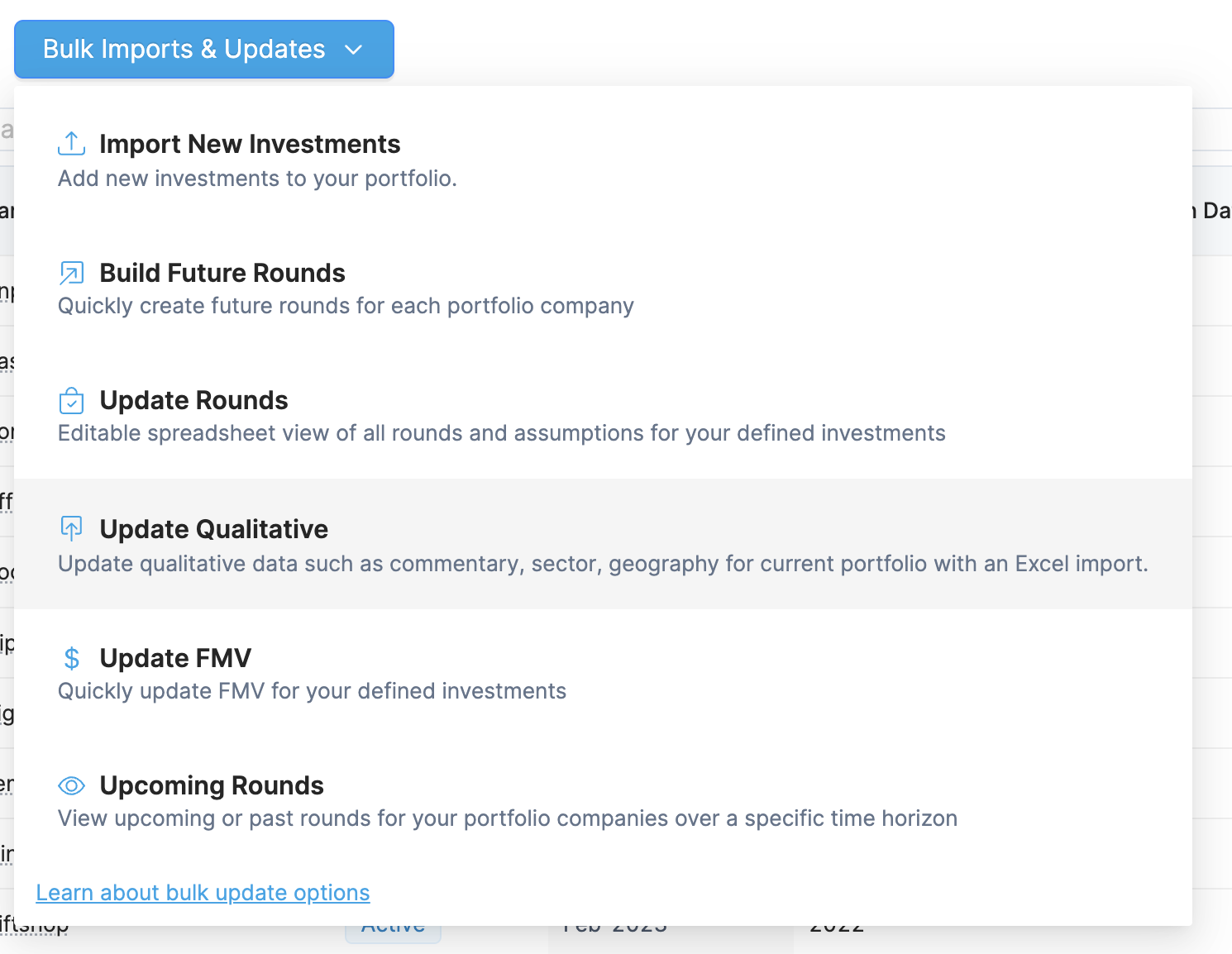 Periodically, you may want to “bulk update” multiple investments quickly. For e.g. changing assumptions for future funding rounds, future exit scenarios and probabilities or updating sector, commentary etc. Tactyc offers a range of “bulk update” options that are available from the **Bulk Imports & Updates** dropdown from your investments page.