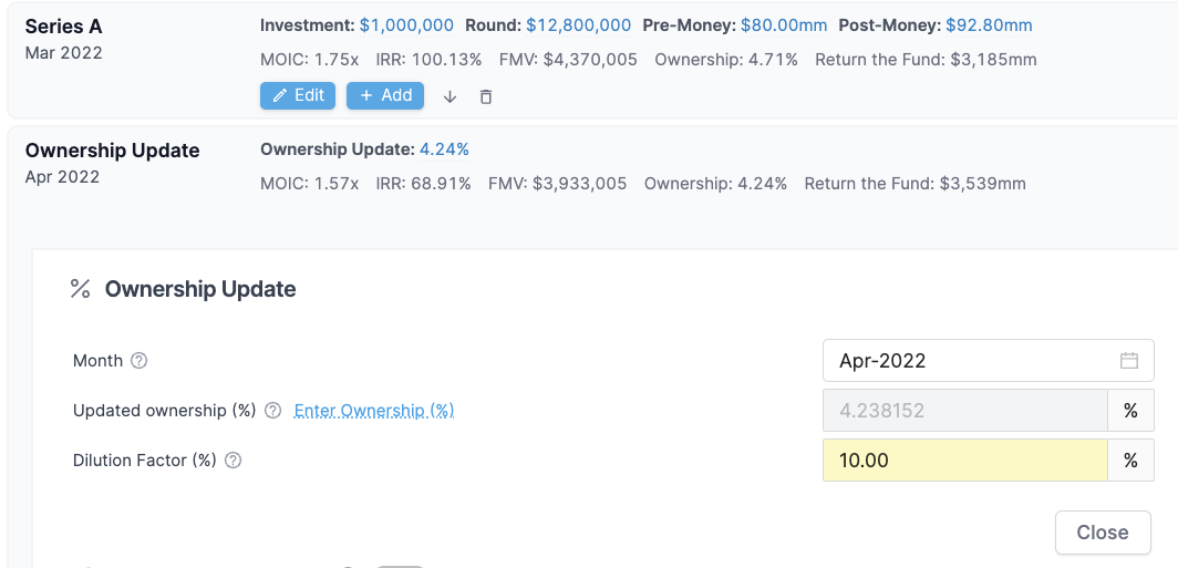 * Add an **Ownership Update** event after the financing round to enter your new ownership after ESOP pool. You can also directly enter the **Dilution Factor** from the ESOP pool if you prefer.