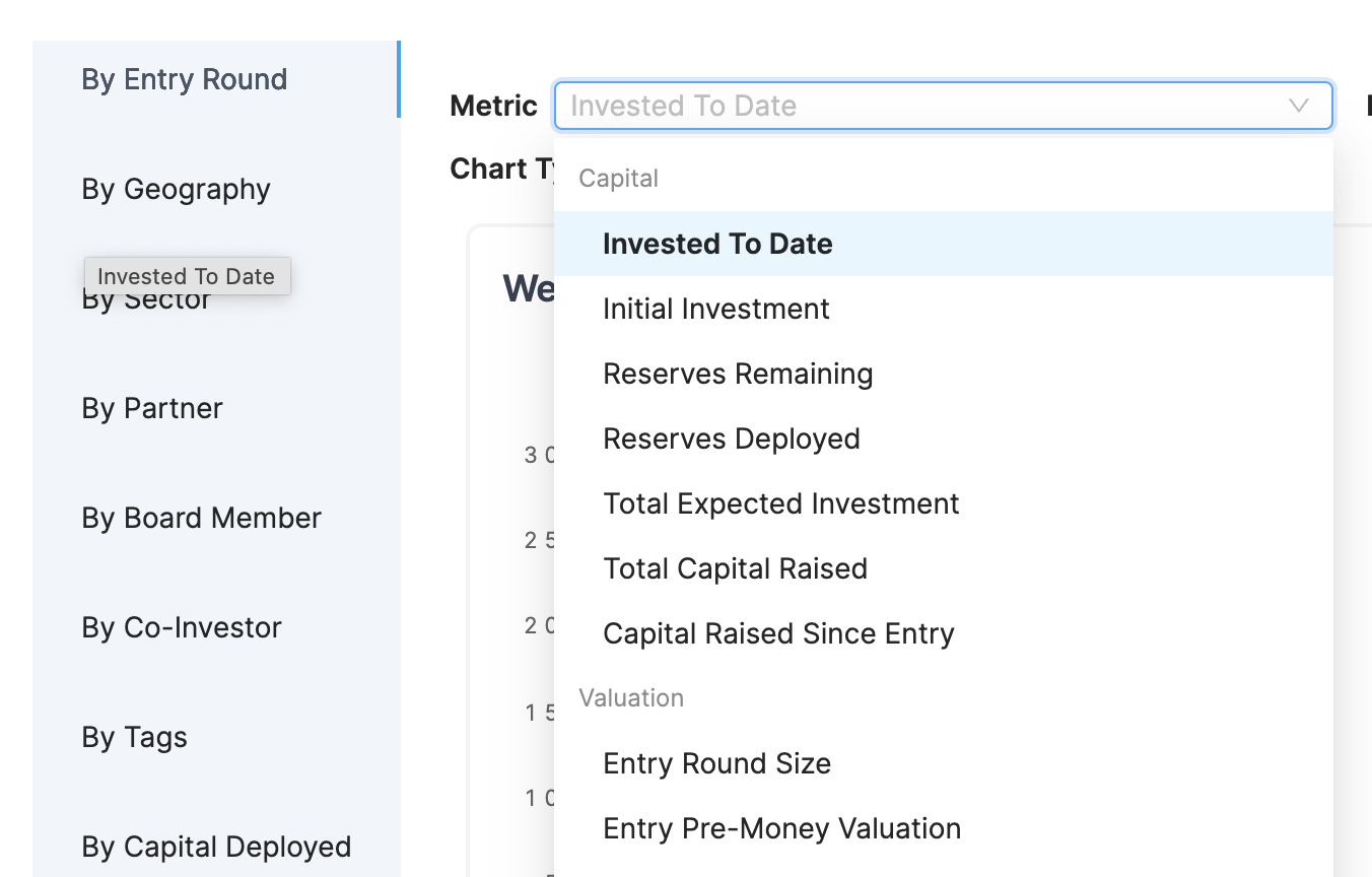 There are more than 65 reporting metrics available for each investment. These metrics can be accessed in 3 different areas on your fund dashboard: