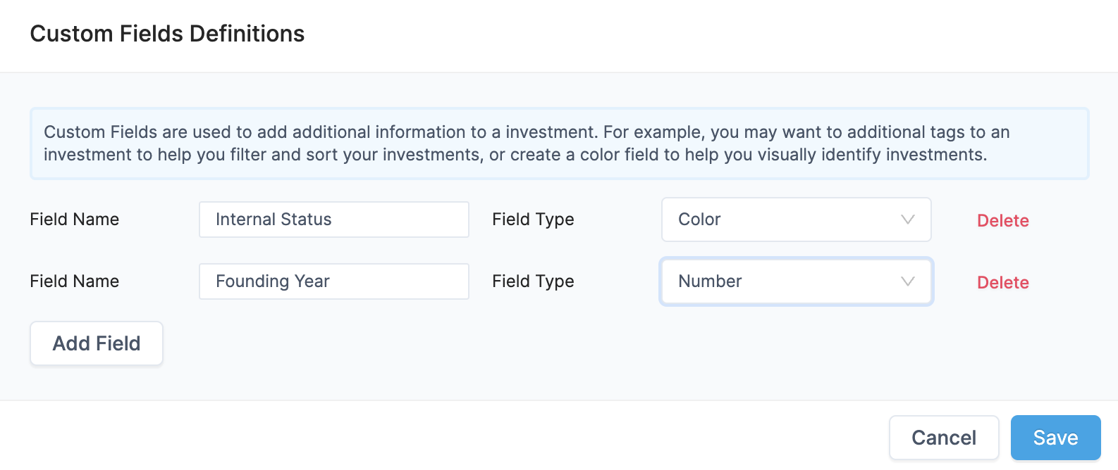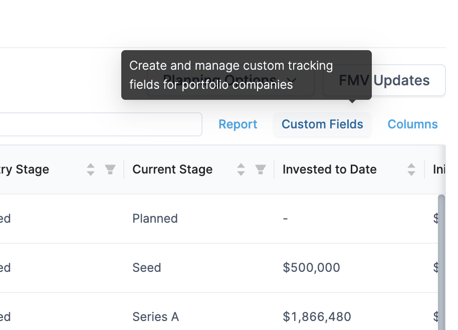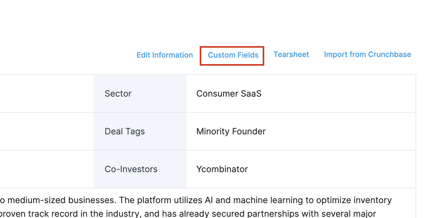 Custom fields enable you to create your own tracking fields such as tags, dates, numbers or text to categorize portfolio companies