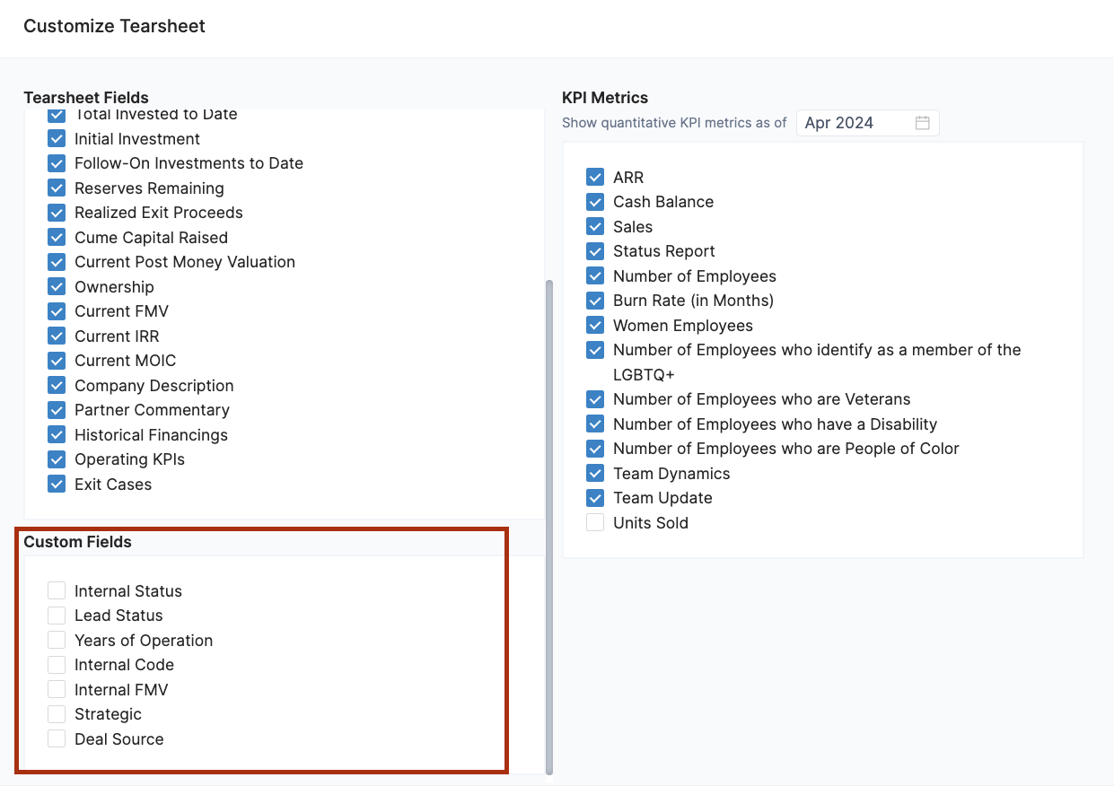 Custom Fields created can also be added to the tearsheet from the Customize dialog. Select desired custom fields and they will be shown on the left sidebar of each tearsheet.