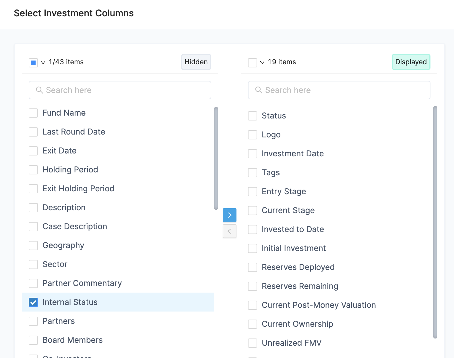 Custom Fields can also be exposed on the investments table from the Columns configuration. These custom field columns can be filtered or sorted to evaluate performance for specific sub-sections of the portfolio.