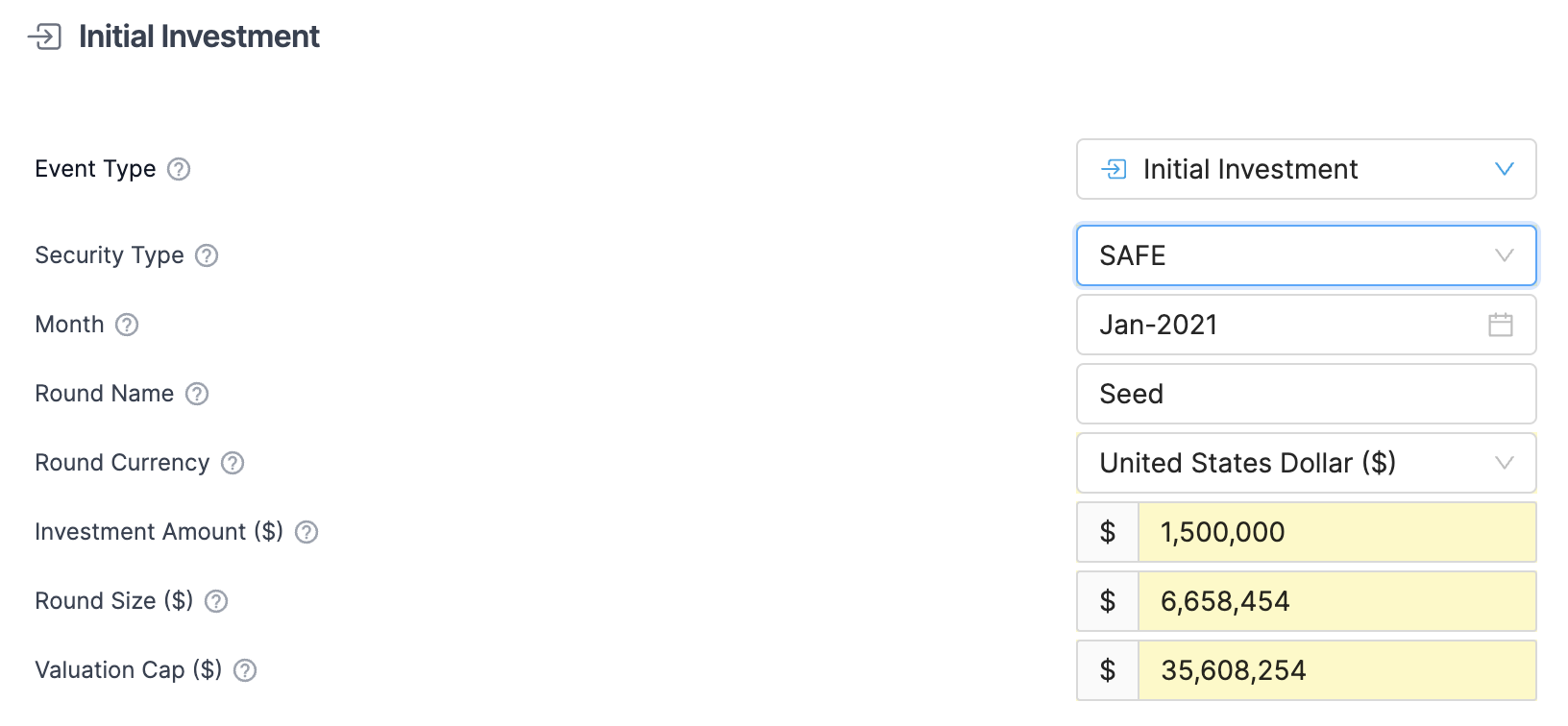 * Enter the amount invested under the **Investment Amount** field. Total capital raised by the company in the SAFE/Note is entered as the **Round Size.** Specify the **Valuation Cap** ([see here](#uncapped-safes-or-notes) for uncapped notes)