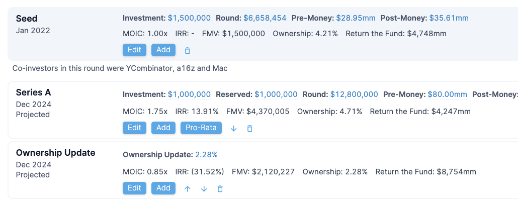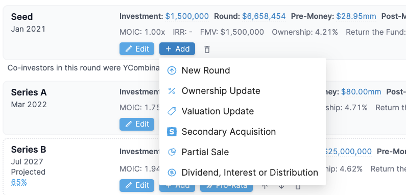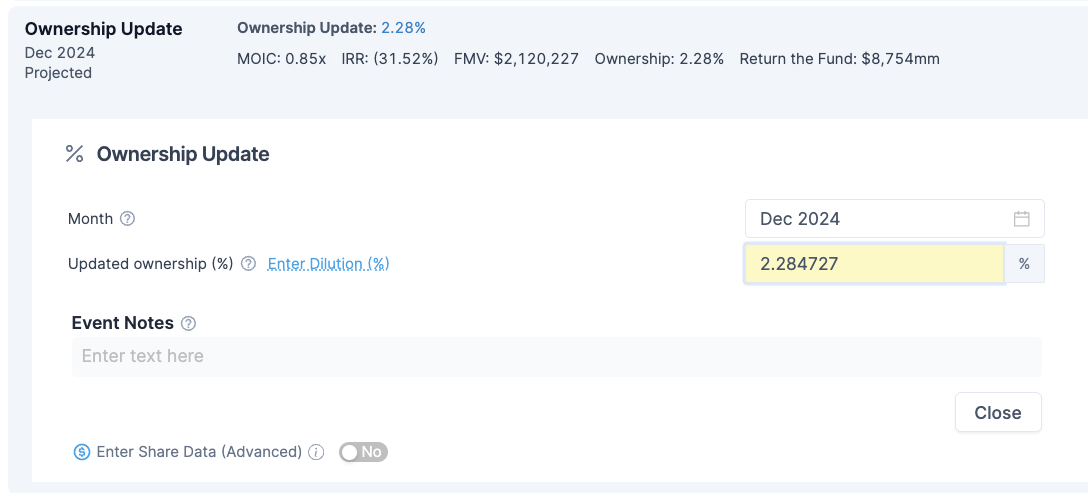 * [Apply an ownership update](https://docs.tactyc.io/portfolio-management/managing-rounds/updating-ownerships) after the priced round and enter the fund's ownership in the company post-conversion in the **Ownership Update**