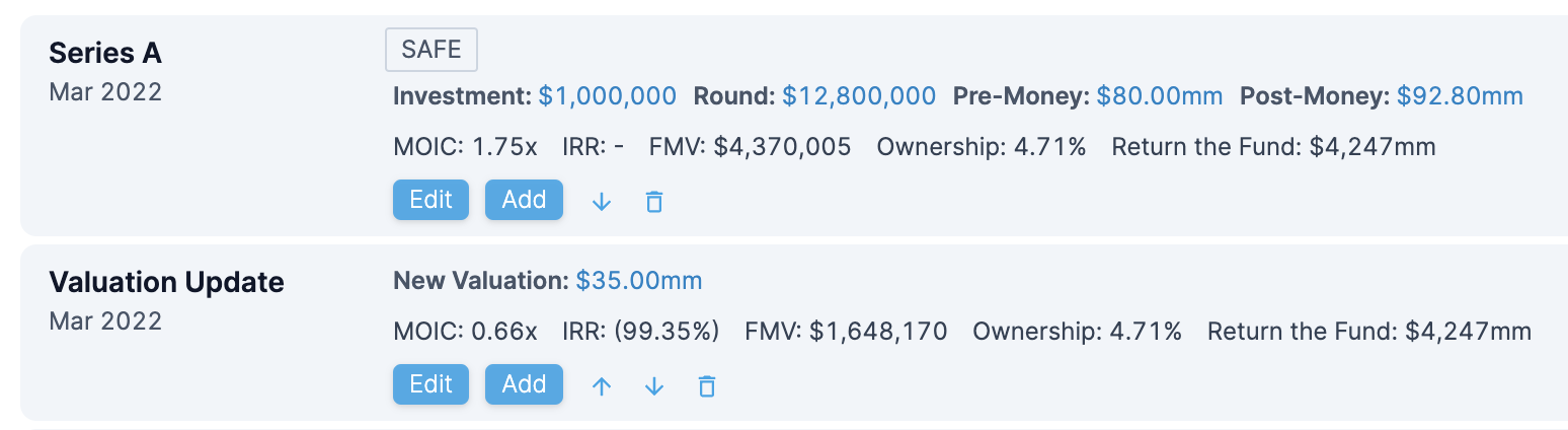 Some funds (most) hold their portfolio companies at the latest valuation caps, while others wait for a priced round to assign a valuation to the company. By default Tactyc will move up or down the valuation of the company based on the last cap of the SAFE or Convertible Note.