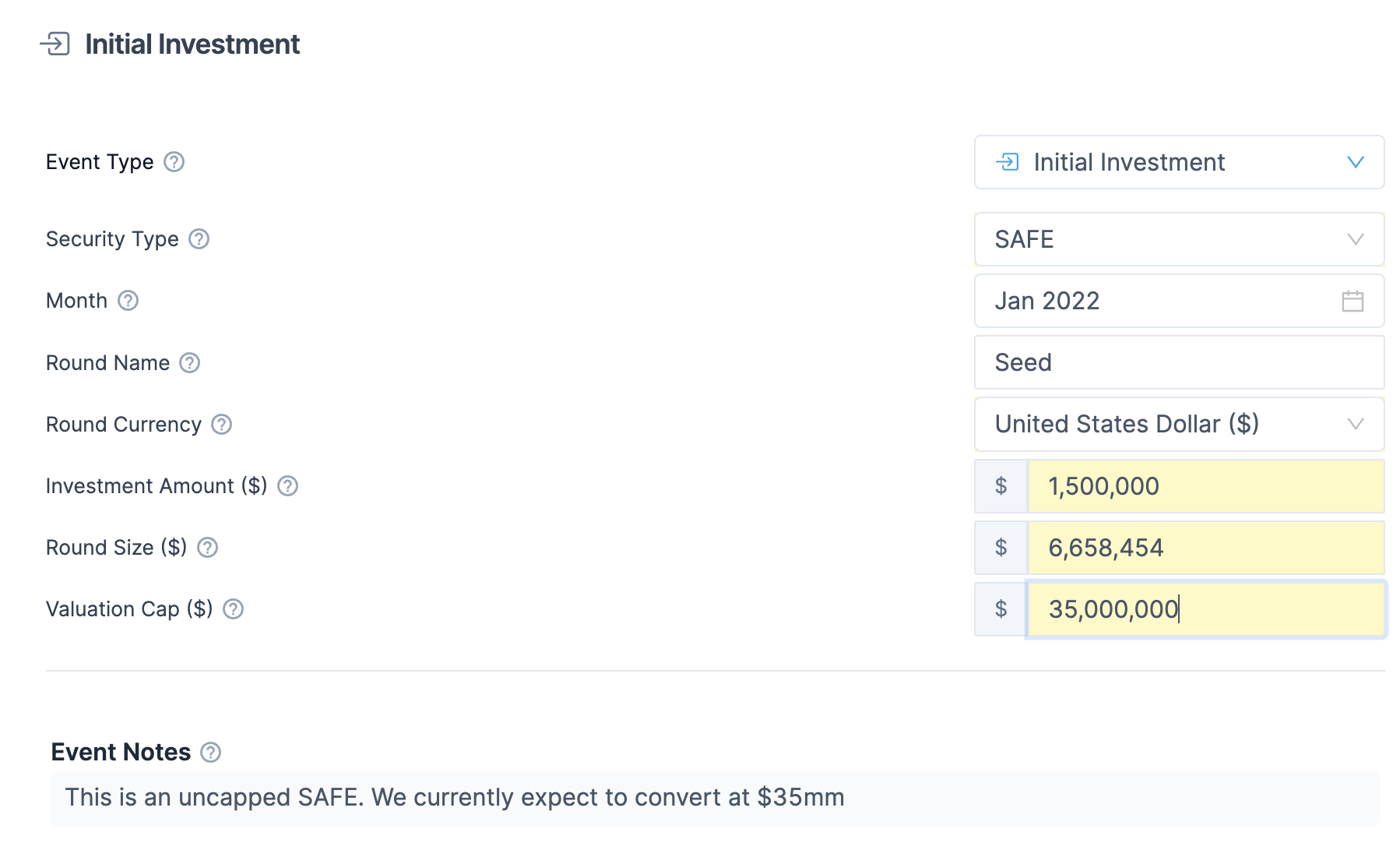* Enter a valuation cap you *expect to convert at*. This is typically the valuation of the next round. You may want to enter a note for this round to say "This is an uncapped SAFE. We currently expect to convert at \[$x]mm". This is for reporting purposes.