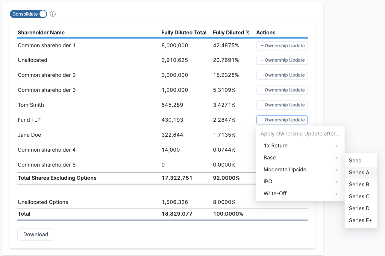 * Use the provided [Cap Table Calculator](https://docs.tactyc.io/portfolio-management/cap-table-calculator) to configure a cap table simulation where you can configure existing SAFEs and Notes along with parameters of the future priced round. The results of the conversion will be shown in the **Pro-Forma Cap Table**. You can apply the results of this simulation by clicking on the **+ Ownership Update** button next to your fund's ownership.