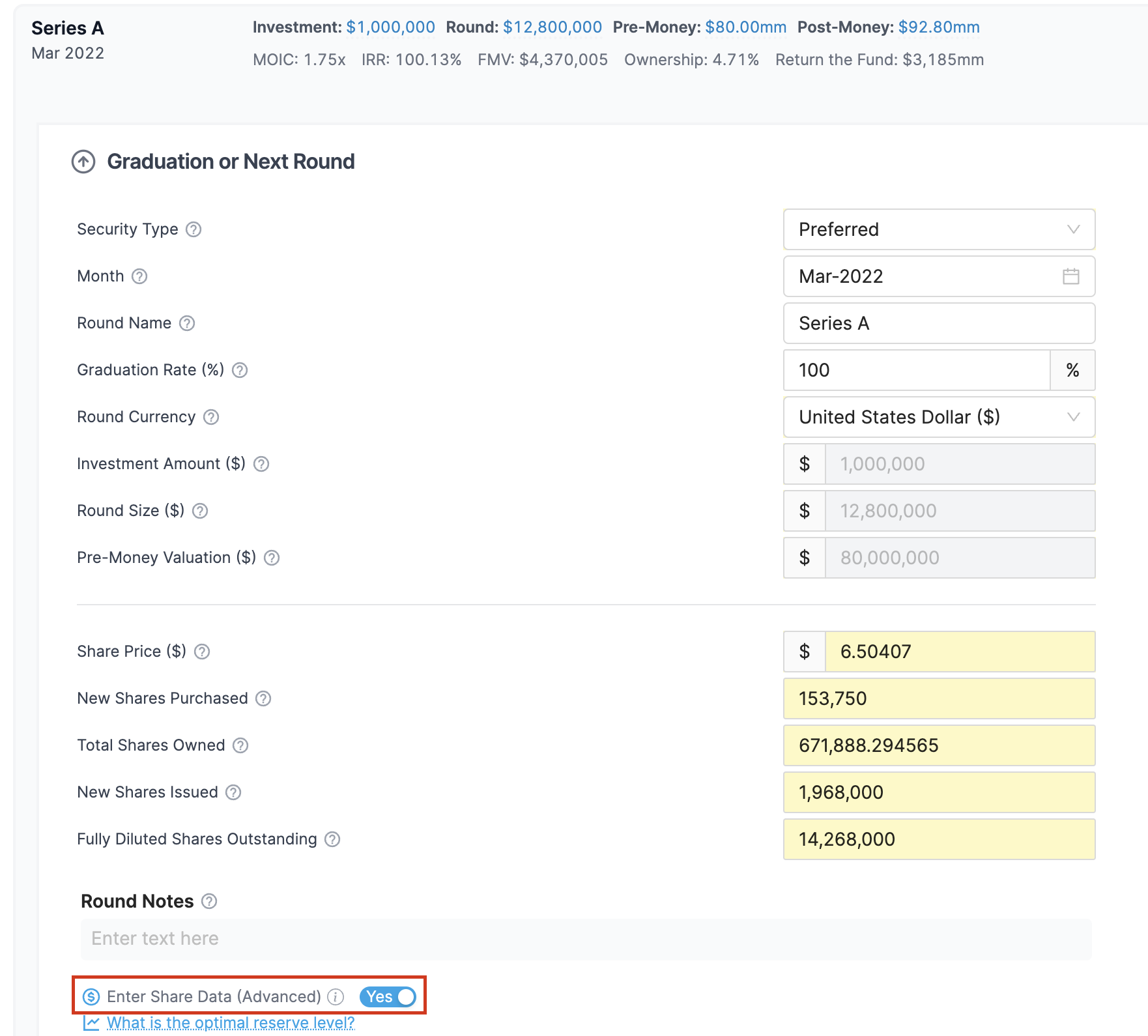 * Edit the priced round and enable **Enter Share Data**